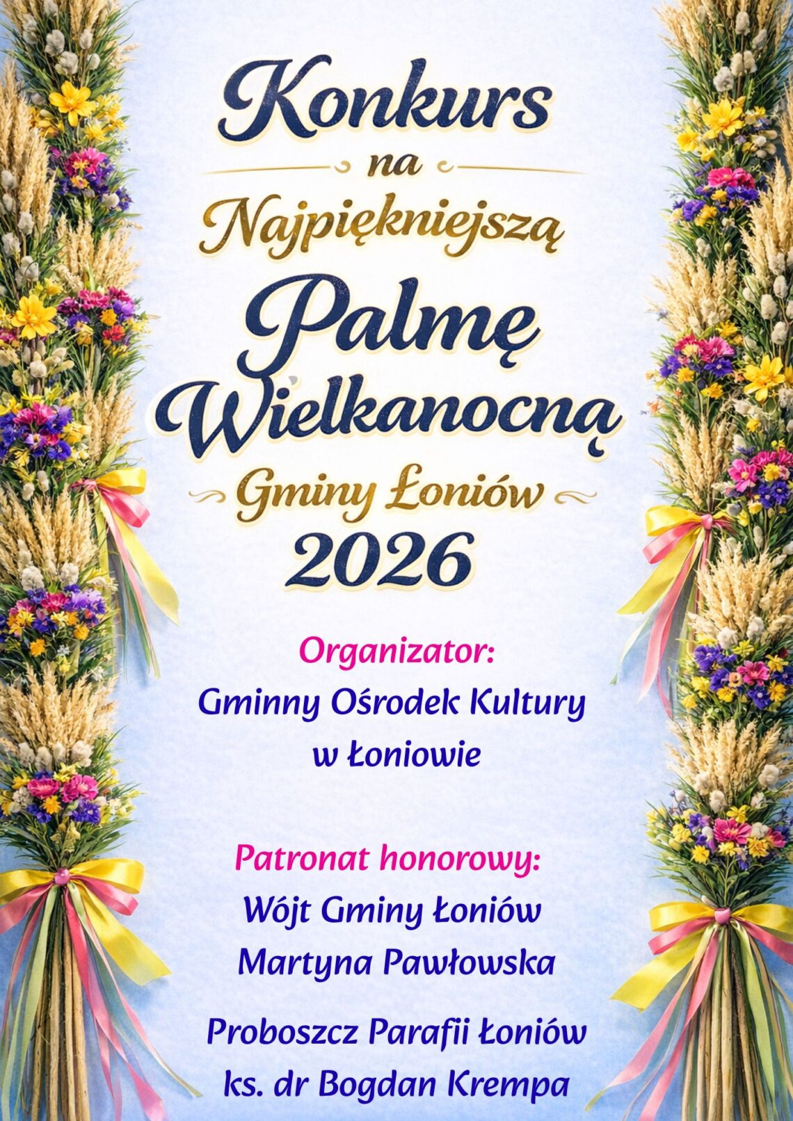 Konkursu na Najpiękniejszą Palmę Wielkanocną Gminy Łoniów 2026 ORGANIZATORZY: Gminny Ośrodek Kultury w Łoniowie Patronat honorowy: Wójt Gminy Łoniów; Proboszcz Parafii Łoniów. CELE KONKURSU: kultywowanie tradycji i zwyczajów wielkanocnych związanych z Niedzielą Palmową oraz Wielkanocą; pogłębienie wiedzy na temat symboliki i znaczenia palmy w obrzędowości ludowej; przekaz wartości i tradycji ludowej; integracja społeczności lokalnej TEMATYKA PRAC: przedmiotem konkursu jest własnoręczne wykonanie palmy wielkanocnej z zachowaniem tradycyjnych technik plastycznych.
